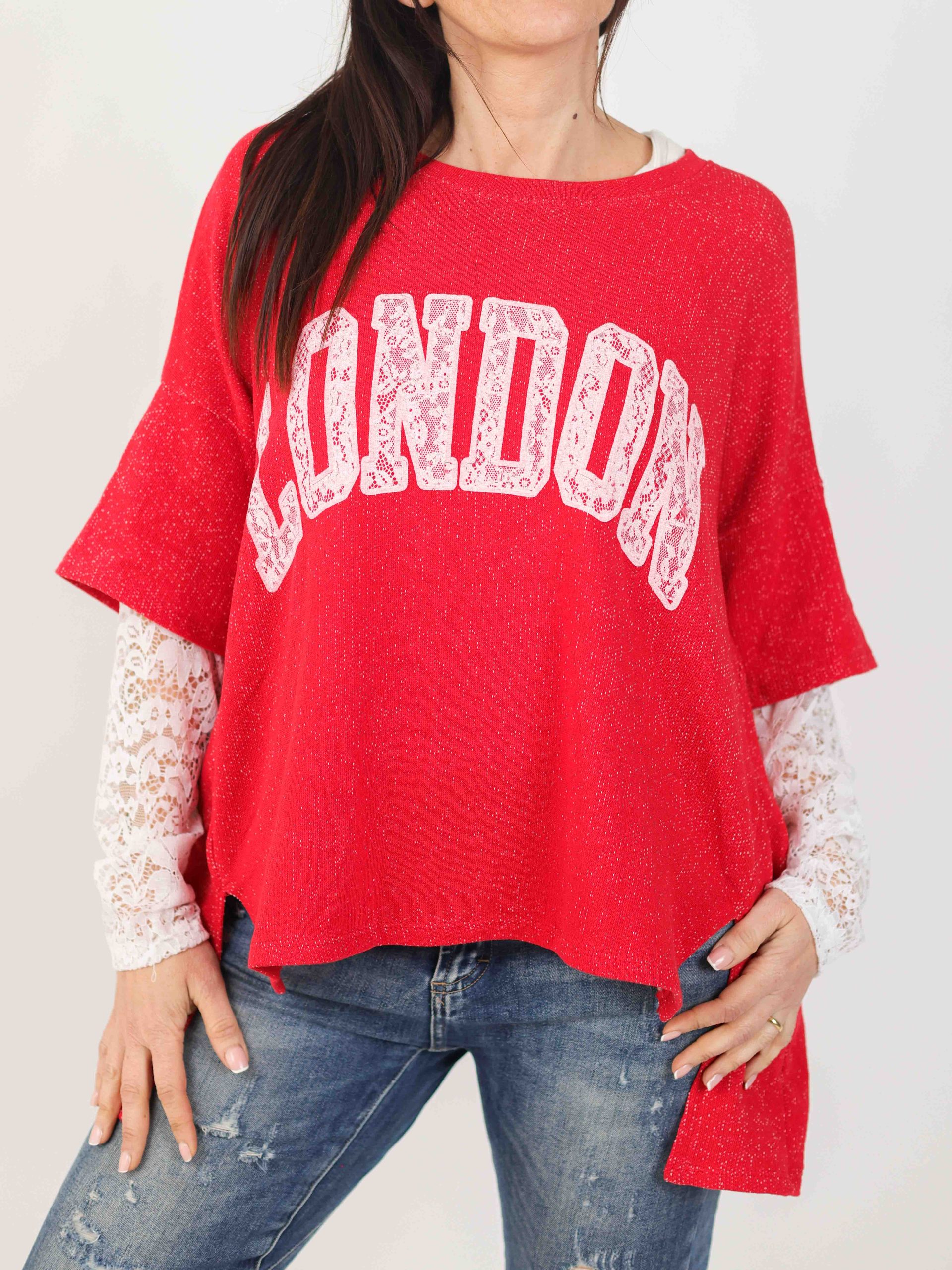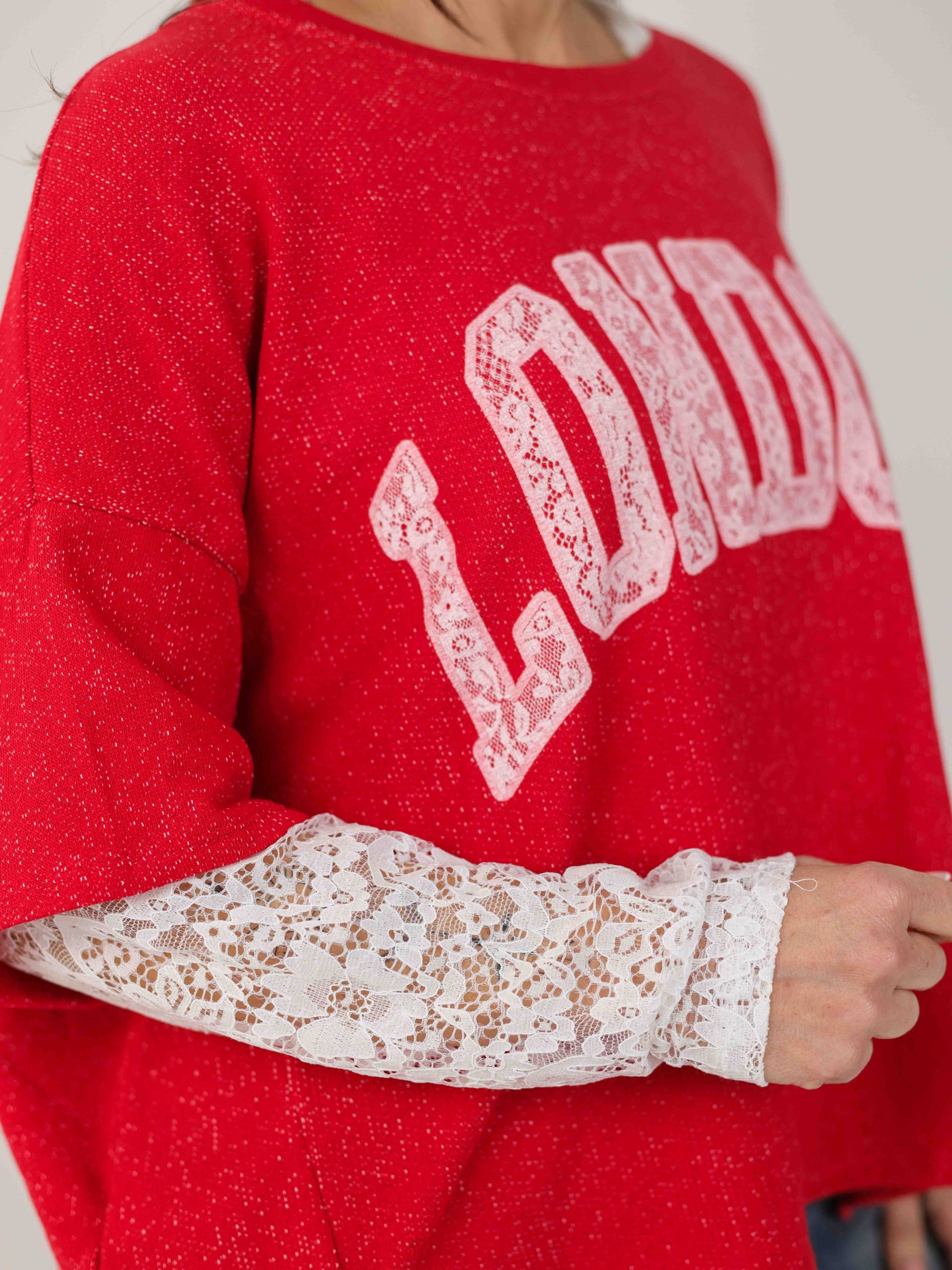 Jersey para mujer de manga larga con mangas en encaje blanco. Cuello tipo barco y largo trasero. Decoración en letras London.